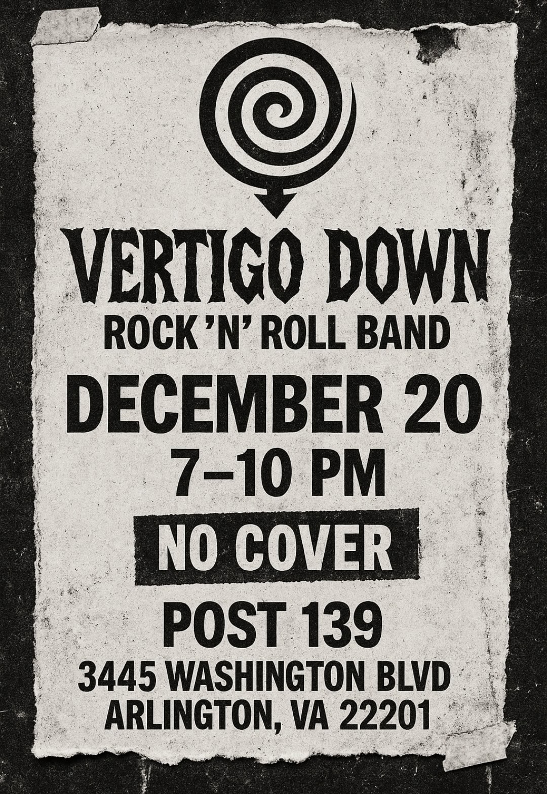 Vertigo Down returns for another fantastic night of high energy rock-n-roll music. No cover and lowest drink prices in the area. Open ecvent