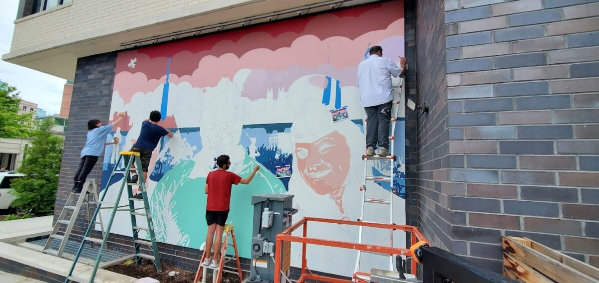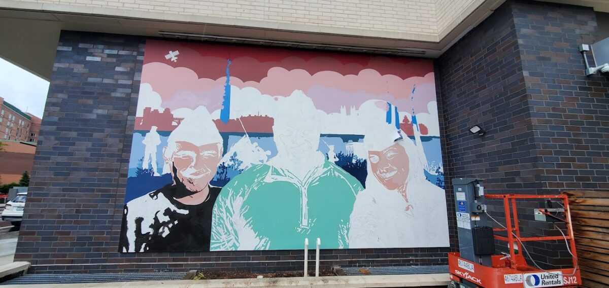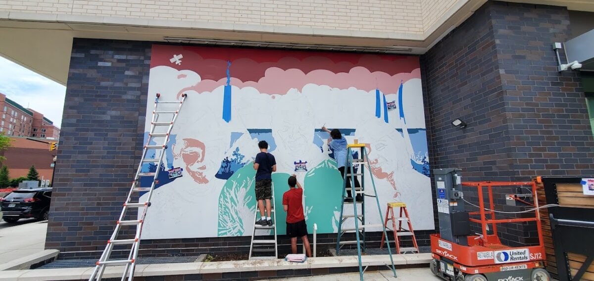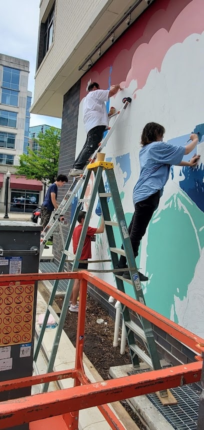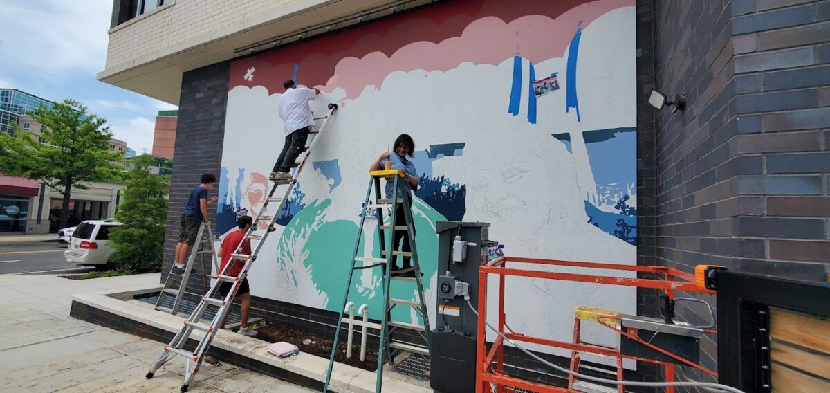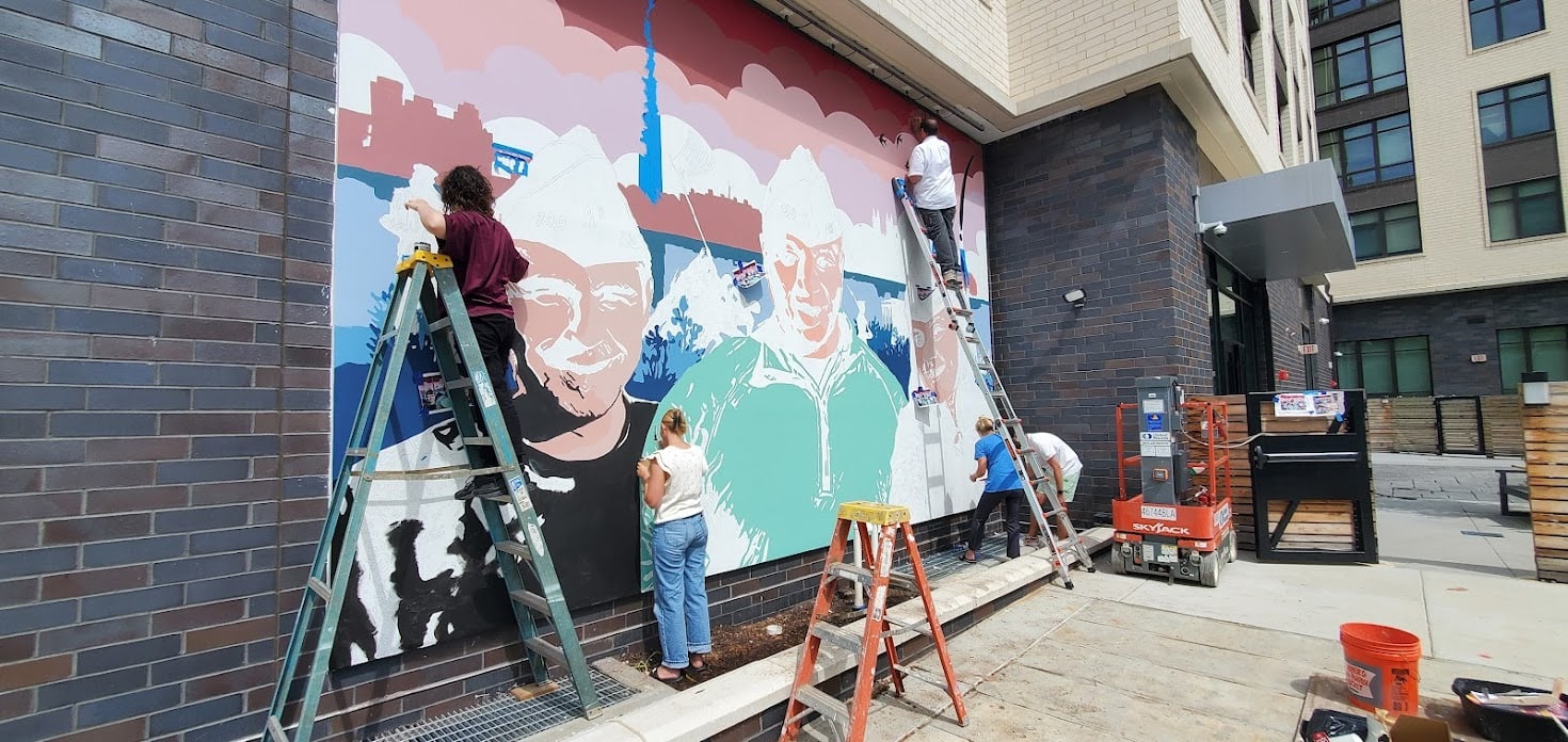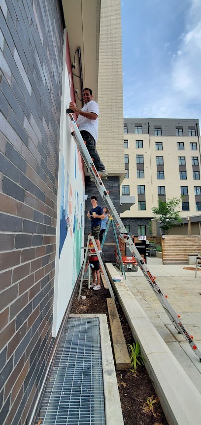 22 ft x 15 ft painted mural on the side of the new Post 139 building in Arlington, started about a year and half before the finals stages of construction. Designs were approved by the post executive committee, project architects and local government. The image is painted with acrylic paint on a composite surface and will be sealed with an anti-graffiti coating when completed. The image depicts representative images of legion members belonging to the local community, the back midground images represent each of the branches of service highlighted by unique memorials for each (most of which are in Arlington, except the Navy and the Satellite) Looking past Arlington you see the skyline of Washington DC in the distance. Post 139 and Arlington support Veteran needs and is seen as a gateway to the nation's capital