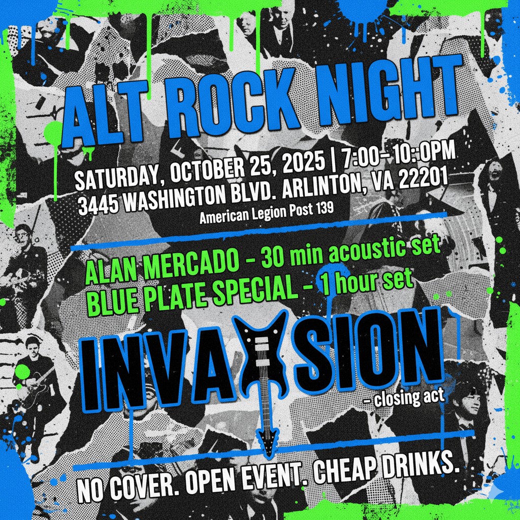 American Legion Post 139 3445 Washington Blvd, Arlington, VA, United StatesHang out for a night of cool music with 3 different bands. No Cover, Open Event. Listen to the best of the 80's through 2000's music. Cheap drink prices and a chill setting.